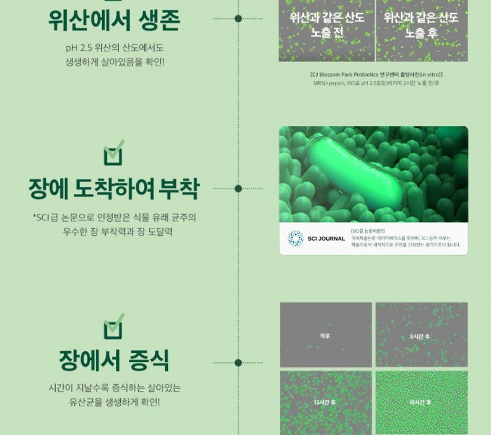 CJ가 직접 찾아낸 생명력 강한 유산균! BYO 식물성 유산균! 강한 산성을 가진 김치의 환경인 PH 3.0에서 추출하여 위산과 담즙을 거쳐 버텨 장까지 살아가는 유산균입니다.CJ독자개발특허균주 CJLP243 락토바실러스 프란타륨은 국제적으로 12개국 특허와 세계적인 학술논문지 SCI급 논문 인증으로 확인한 생명력 강한 유산균입니다.신바이오틱스 는 프로바이오틱스라는 유익한 생균을 직접 공급하여 장내 유익균을 증식하는 방식에다가 유익균의 먹이인 프리바이오틱스까지 공급하여 장내 유익균을 증식하는 방식을 적용하였습니다.하루 1포 100억 보장은 먹을때 보장되는 균수로서 1포에 투입된 생균수가 먹을때까지 얼마나 살아 있는지를 보장하는 보장균수가 더 중요하게 됩니다.투입균수가 아닌 드실때의 보장균수가 100억인 상품입니다.상온에서도 살아 있는 유산균 맛잇는 요거트맛으로 전 연령 섭취가능하고 시간에 상관 없이 식전.식후 구별없이 물과함께 또는 음식에 타서 섭취하면 할 수 있습니다.나무를 베지 않고 100% 사탕수수에서 추출한 종이로 만들고 표백과 코팅이 없어 미생물에 생분해될 수 있는 자연그대로의 프리미엄 친환경 포장재를 사용하였습니다.