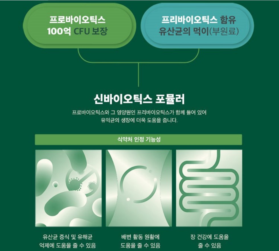 CJ가 직접 찾아낸 생명력 강한 유산균! BYO 식물성 유산균! 강한 산성을 가진 김치의 환경인 PH 3.0에서 추출하여 위산과 담즙을 거쳐 버텨 장까지 살아가는 유산균이다.CJ독자개발특허균주 CJLP243 락토바실러스 프란타륨은 국제적으로 12개국 특허와 세계적인 학술논문지 SCI급 논문 인증으로 확인한 생명력 강한 유산균이다.신바이오틱스 는 프로바이오틱스라는 유익한 생균을 직접 공급하여 장내 유익균을 증식하는 방식에다가 유익균의 먹이인 프리바이오틱스까지 공급하여 장내 유익균을 증식하는 방식을 적용하였다.하루 1포 100억 보장은 먹을때 보장되는 균수로서 1포에 투입된 생균수가 먹을때까지 얼마나 살아 있는지를 보장하는 보장균수가 더 중요하다.투입균수가 아닌 드실때의 보장균수가 100억인 상품이다.상온에서도 살아 있는 유산균 맛잇는 요거트맛으로 전 연령 섭취가능하고 시간에 상관 없이 식전.식후 구별없이 물과함께 또는 음식에 타서 섭취하면 할 수 있다.나무를 베지 않고 100% 사탕수수에서 추출한 종이로 만들고 표백과 코팅이 없어 미생물에 생분해될 수 있는 자연 그대로의 프리미엄 친환경 포장재를 사용하였다.