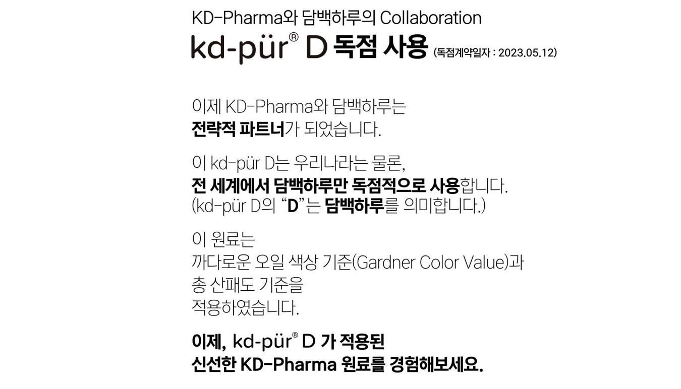 독일 KD Phama사와 담백하루의 Collaboration KD Pur ˙˙ⓡ D 특허공법을 2023년 5월21일부터 전세계에서 담백하루만 사용할 수 있도록 독점계약하였습니다.D는 담백하루을 의미합니다.혈행에 좋은 담백하루 초임계 알티지오메가3 에센스는 100% 저온 초임계 추출 특허공법을 사용하여 열에 약한 원료를 최대한 보호하고 짧은 첨단 정제 과정으로 산패 위험도를 낮추었습니다.저온 초임계 추출공법이란 핵산이나 과도한 열을 사용하지 않고 어유(생선기름)를 정제하는 기술로서 50º 이하의 저온에서 독성이 없고 인체에 무해한 이산화탄소를 사용해 잔여물이 없고 r-TG오메가3 최고순도 80% 의 EPA 및 DHA함유 유지 오메가3를 추출하고 분리하는 방식입니다.먹이사슬 아래쪽에 위치한 소형어류에서 추출한 원료를 사용하여 해양오염 및 중금속 위험을 낮춘 오메가3 세계3대 유명 원료회사의 하나인 독일 KD Phama사의 오메가3 를 사용하였습니다.식약처 건강기능식품인증 및 GMP 시설에서 제조하였습니다.오메가3 영양제는 산패도가 가장중요하다고 보겠습니다.따라서 병에 들어있는 제품은 병뚜겅을 개봉할 때마다 공기와 접촉되어 산패할 가능성이 더 높다고 보겠습니다.또한 외국제품은 여러 통로로 운반과정에서 유통기한이 늘어날수 있기 때문에 국산 오메가3가 여려면에서 유리하고 국내 제조사가 유명원료을 사용하였다면 품질면에서도 뒤떨어지지 않기 때문에 개별포장된 국산제품을 사용하는 것이 산패도 있어서 무난하고 훌륭한 오메가3를 선택하는 방법이 될 것입니다.
